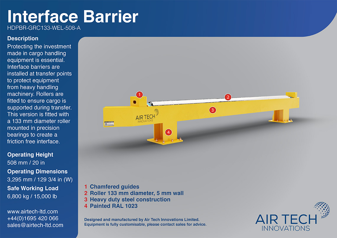 Protecting the investment made in cargo handling equipment is essential. Interface barriers are installed at transfer points to protect equipment from heavy handling machinery. Rollers are fitted to ensure cargo is supported during transfer.